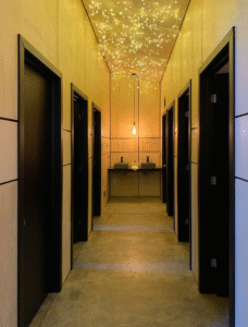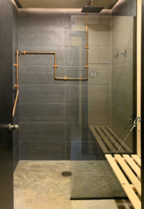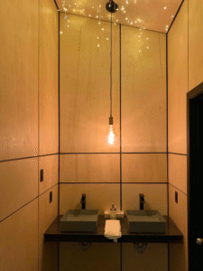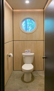El volumen oscuro se mimetiza entre los árboles, permitiendo que la luz y las sombras del bosque definan su presencia. Su diseño busca un equilibrio entre funcionalidad y discreción, ofreciendo baños y espacios de servicio esenciales, sin romper la serenidad del lugar.