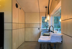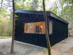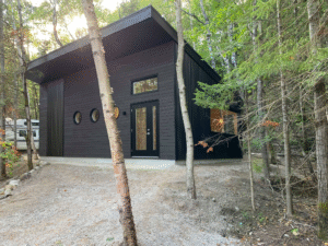 Ubicado en medio del bosque de Charlevoix, este bloque de servicios fue diseñado para complementar el glamping resort, sin alterar la armonía del entorno natural. Su arquitectura sobria y compacta se integra al paisaje mediante el uso de madera proveniente de la región, lo que refuerza su carácter local y sostenible.