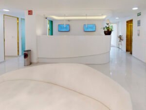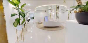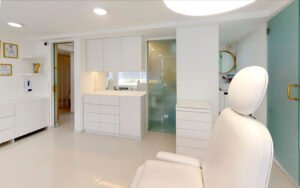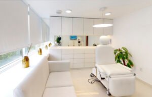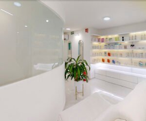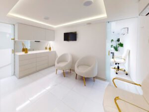 La estética general responde a la necesidad de transmitir limpieza, serenidad y profesionalismo. Por ello, el blanco domina la paleta cromática, reforzando la sensación de pulcritud y amplitud, mientras que los acentos dorados aportan sofisticación, calidez y un carácter distintivo propio del ámbito estético. Las texturas suaves, la iluminación indirecta y el mobiliario cuidadosamente seleccionado complementan la atmósfera de bienestar.