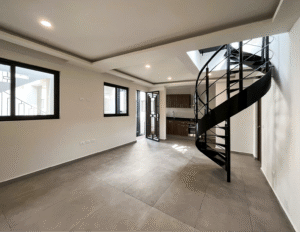 El diseño interior se caracteriza por una estética sobria y funcional, donde los materiales y acabados dialogan con la geometría existente. La escalera helicoidal metálica se convierte en el elemento protagonista, conectando los niveles y aportando una presencia escultórica que contrasta con la neutralidad del conjunto.